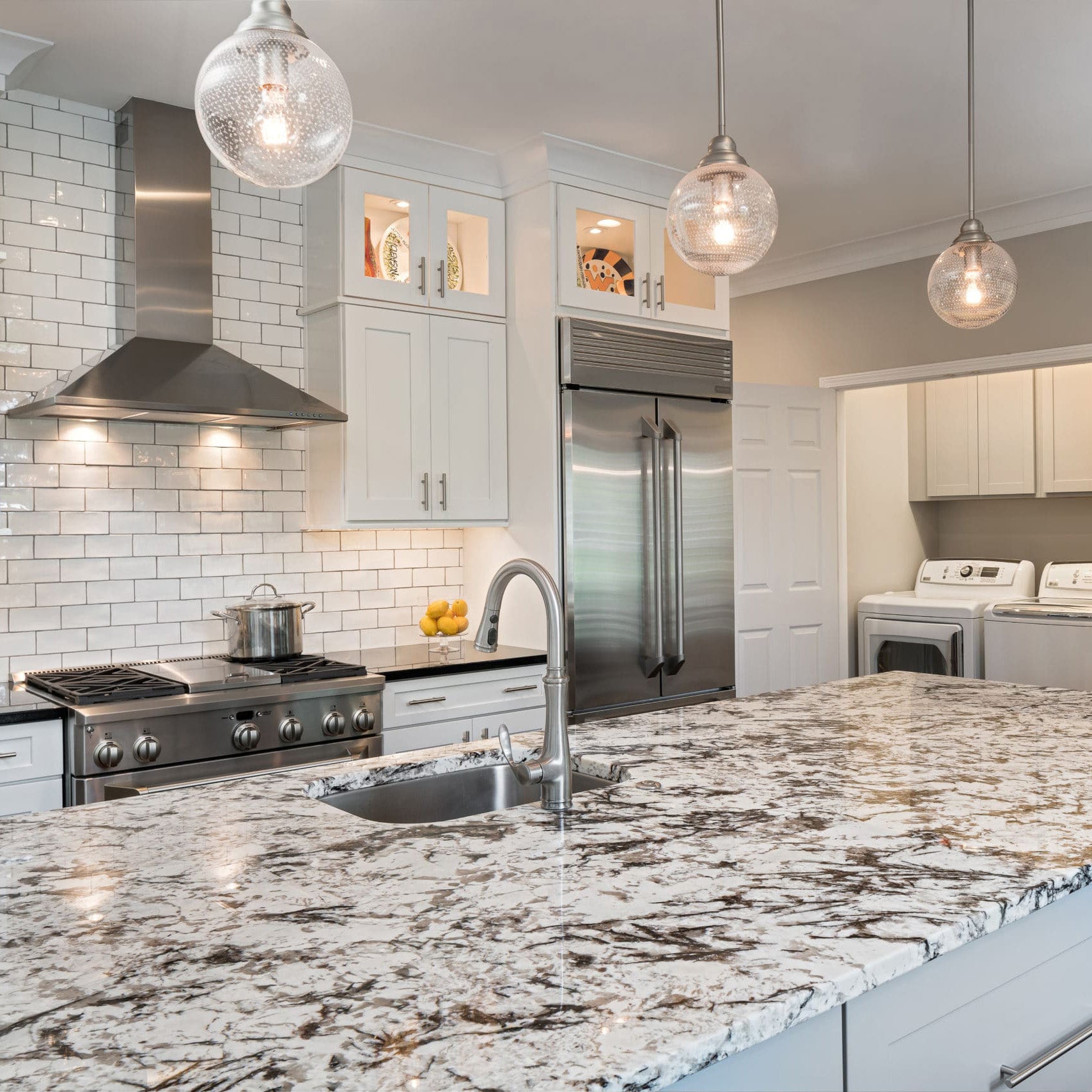 "Alaska White Granite, sourced from quarries known for their high-quality stone in Alaska, features a stunning white background with intricate grey veining and occasional hints of burgundy. Renowned for its durability and elegant appearance, it enhances both residential and commercial spaces with a timeless, sophisticated charm."