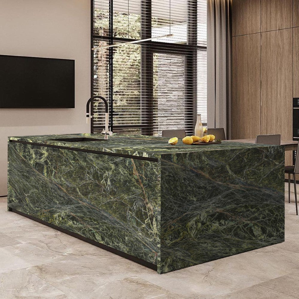 Rainforest Green marble countertops are renowned for their rich, deep green base adorned with dramatic brown and gold veining, reminiscent of a lush forest. This exotic stone brings a bold and unique aesthetic to kitchens and bathrooms, making a striking statement in any design. Each slab is uniquely patterned, ensuring that no two countertops are alike. With proper care, Rainforest Green marble not only enhances your space but also offers lasting beauty and durability.